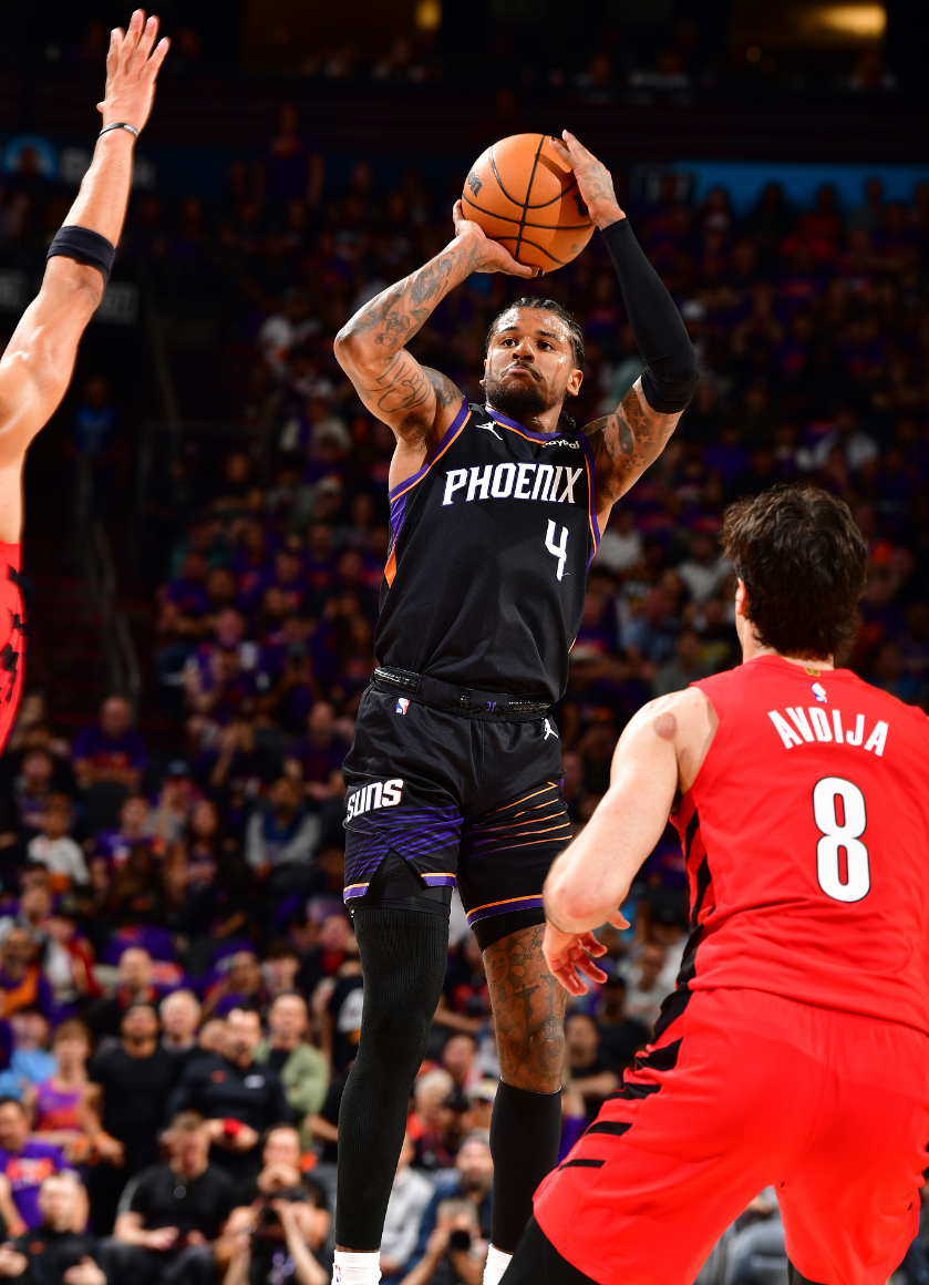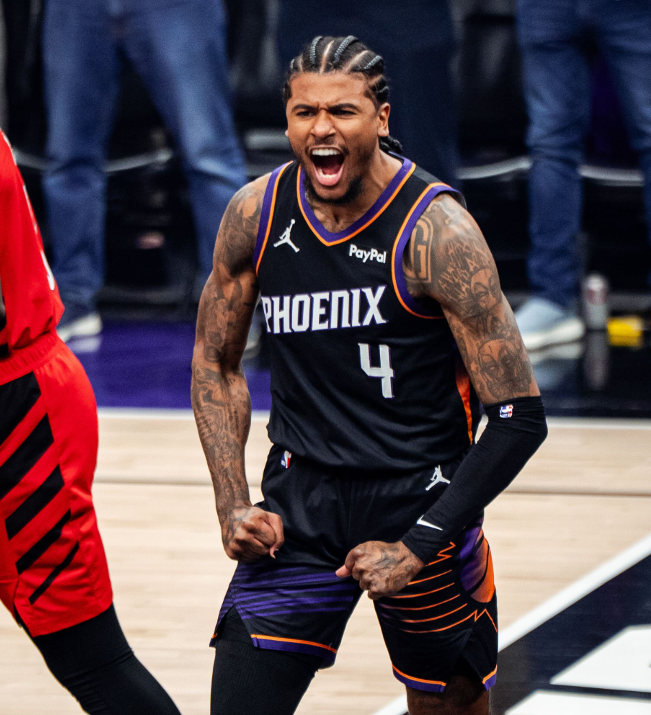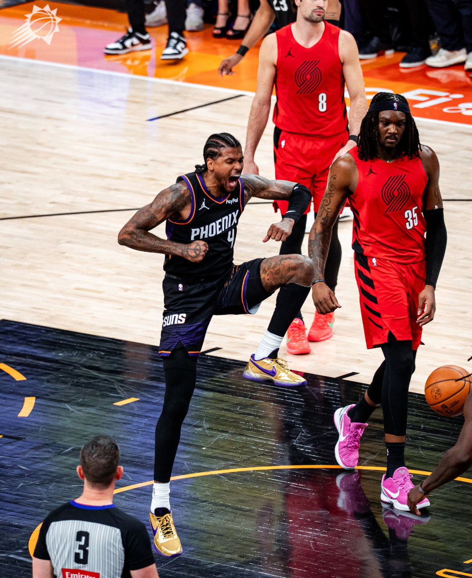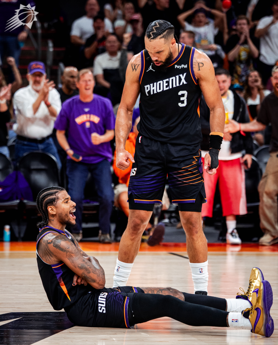 第二节杰伦-格林更是打出了一个3+1,他与自己火箭时期的兄弟狄龙一同庆祝,交换的一天次节他的进攻欲望还是很强,单节10中4+三分3中1拿到12分1助攻,上半场格林已经拿到22分,而布克半场只有16分,说是格林带队也不为过。