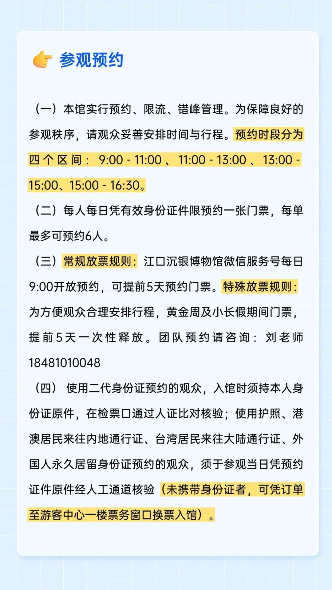 公告中同时发布了参观预约的规则,该馆实行预约,限流,错峰管理。为保障良好的参观秩序,请观众妥善安排时间与行程。预约时段分为四个区间:9:00-11:00,11:00-13:00,13:00-15:00,15:00-16:30。每人每日凭有效身份证件限预约一张门票,每单最多可预约6人。此外,江口沉银博物馆微信服务号每日9:00开放预约,可提前5天预约门票。而黄金周及小长假期间门票,则提前5天一次性释放。