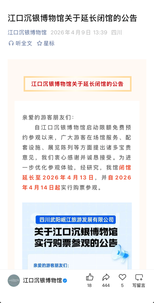 4月9日,江口沉银博物馆官方公众号发布关于延长闭馆的公告,表示为进一步优化参观体验,经研究,该馆闭馆延长至2026年4月13日,并自2026年4月14日起实行购票参观。
