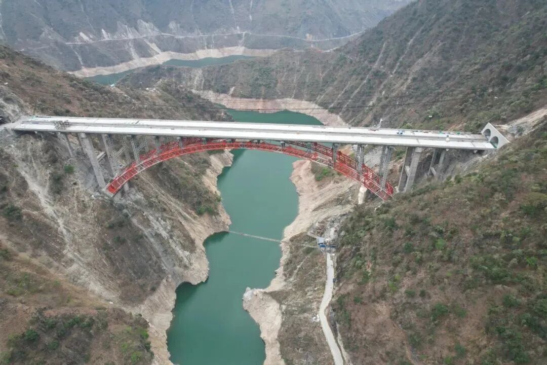 约乌拉达特大桥位于凉山州雷波县,为主跨280米的上承式钢管拱桥,全长404米,衔接西苏角2号、3号隧道,是宜攀高速新金段重点攻坚工程。