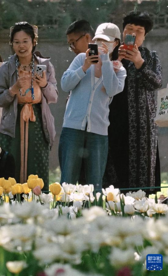 4月10日,游客在北京中山公园拍摄郁金香。